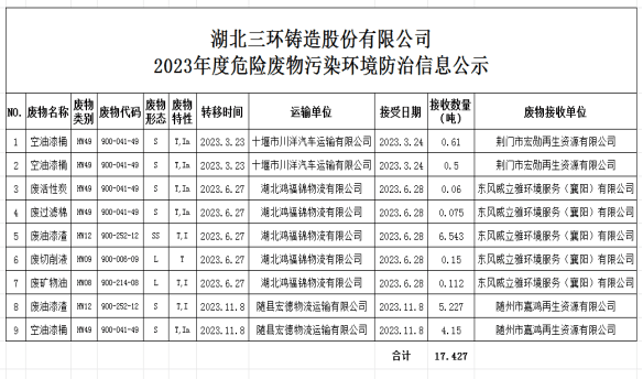 根據(jù)相關(guān)法律法規(guī)和上級(jí)管理部門(mén)的要求,產(chǎn)廢單位需每年將本單位危險(xiǎn)廢物污染環(huán)境防治信息進(jìn)行公示,現(xiàn)將湖北三環(huán)鑄造股份有限公司2023年度危險(xiǎn)廢物污染環(huán)境防治信息公示如下:
