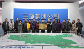 圖2:省委講師團主任喻立平(左二)主持召開座談會 為進一步加強理論武裝工作,1月15日上午,省委宣傳部、省委講師團、省國資委等部門領導一行11人蒞臨三環(huán)集團公司,舉行了“湖北省理論熱點面對面示范點”授牌儀式并進行調研座談。省政協(xié)文史與學習委員會副主任彭明,公司總經(jīng)理梅漢生、黨委副書記景小清、總經(jīng)理助理聶濤等參加了授牌及調研活動。三環(huán)集團公司是省委宣傳部、省委講師團確定的全省15個示范點之一,也是入選的唯一一家國有企業(yè),與武漢工程大學開展聯(lián)系共建。